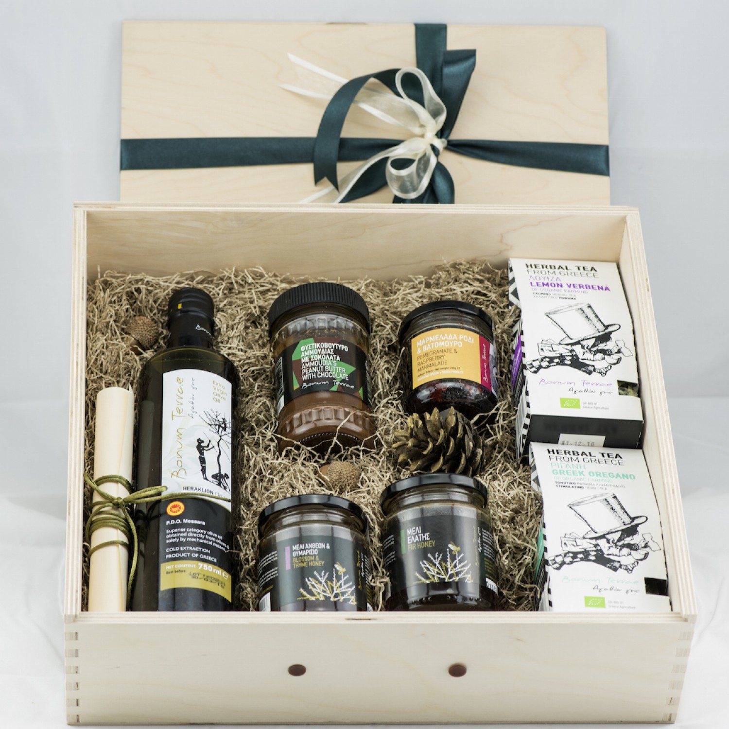 Ξύλινη πολυτελής συσκευασία δώρου, με εκλεκτά προϊόντα από διάφορα μέρη της Ελλάδας, γλυκά (φυστικοβούτυρο, μαρμελάδα, δύο είδη μελιών) και μη (ελαιόλαδο ελιές, βότανα): 500ml Βιολογικό εξαιρετικό παρθένο ελαιόλαδο ΠΟΠ Μεσσαρά, Ελιές καλαμών σε ελαιόλαδο, Φυστικοβούτυρο Αμμουδιάς με σοκολάτα 300gr, Μαρμελάδα με ρόδι και βατόμουρο 250gr, Μέλι ανθέων και θυμάρι 320gr, Μέλι ελάτης 320gr, Βιολογική λουίζα 30gr, Βιολογική ρίγανη 30gr. Το μεγάλο ξύλινο κουτί πολυτελείας κλείνει για ασφάλεια στη μεταφορά!