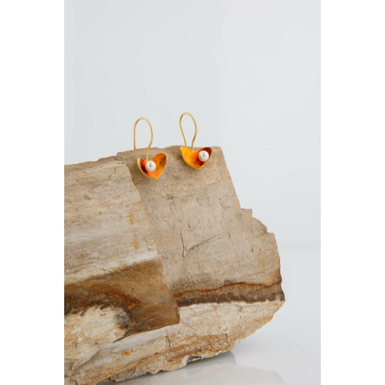Κρεμαστά χειροποίητα σκουλαρίκια από επιχρυσωμένο ορείχαλκο σε σχήμα καρδιάς, βαμμένα με ψυχρό σμάλτο, διακοσμημένα με πέρλα.