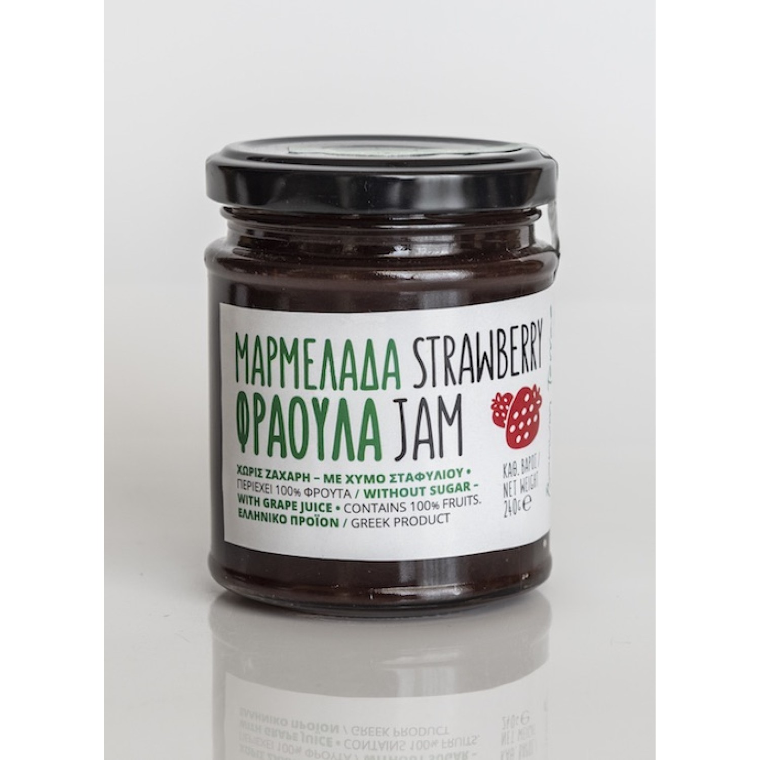 Φτιαγμένη από κατακόκκινες φράουλες της ελληνικής γης και χωρίς την προσθήκη συντηρητικών και ζάχαρης, η μαρμελάδα φράουλα αποτελείται 100% από φρούτα, περιέχοντας φράουλες και χυμό από σταφύλι από καλλιέργειες της Νεμέας.